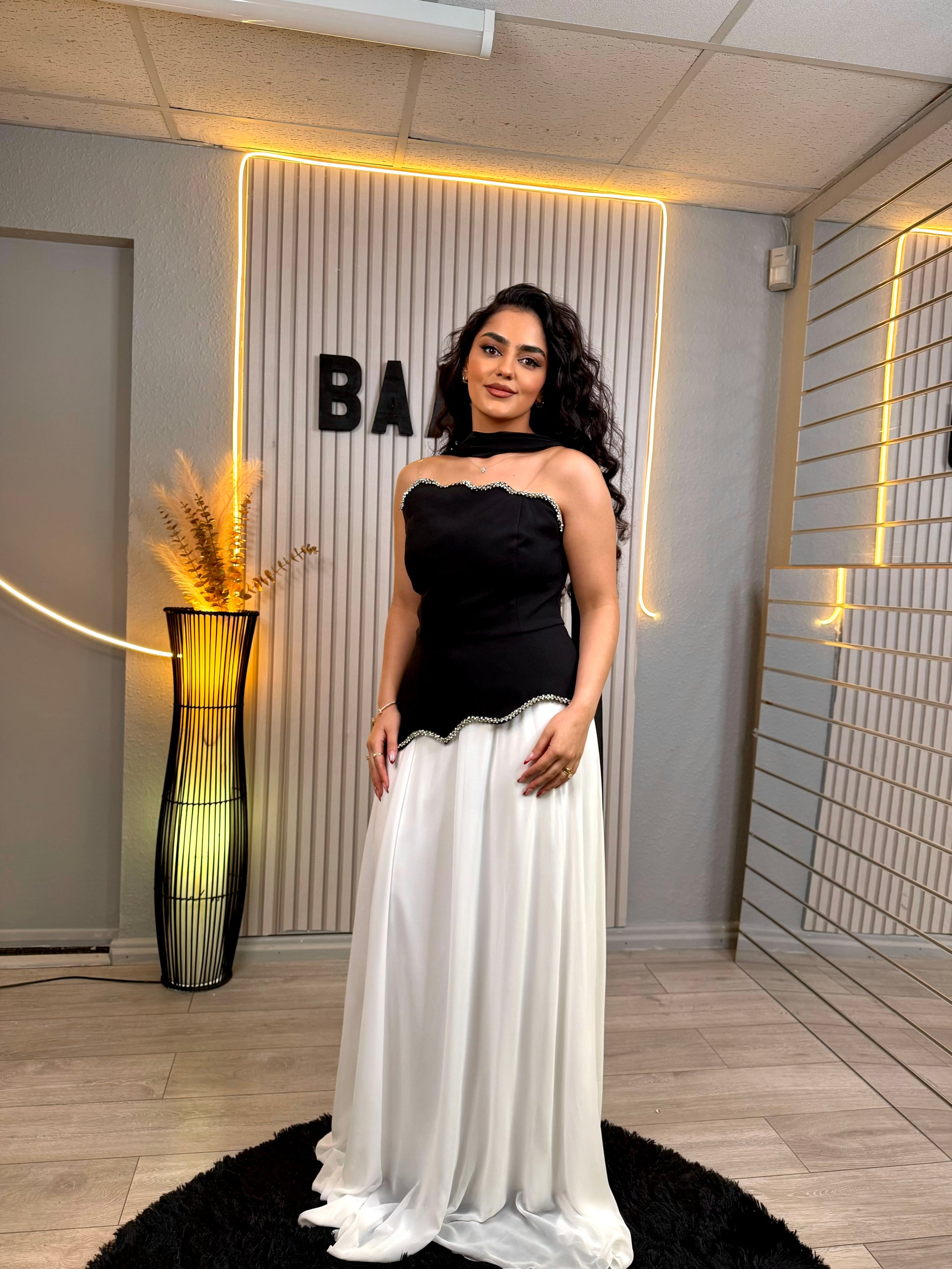 Black and white maxi gown, with diamond embellishments off shoulder with neck scarf