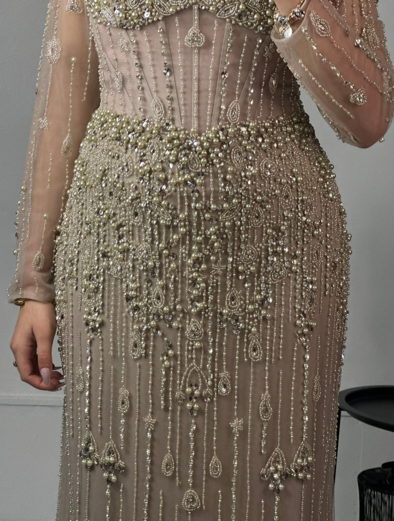 Fully embeExpertly crafted, the Honey Gown dazzles in a beautiful golden/nude color with fully embellished beads. Its detachable train and long sleeves add a touch of elegance and versatility. Perfect for any event, this gown is a must-have for those seeking a glamorous and timeless look.