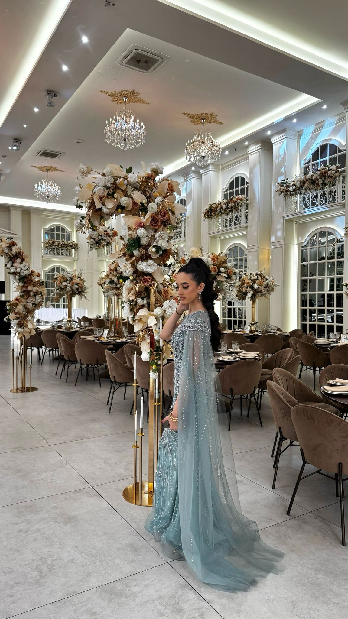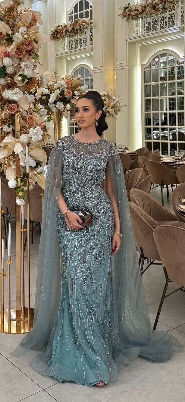 The Peacock gown exudes elegance and sophistication with its fully embellished design and beautiful color. The caped sleeves add a touch of glamour to this maxi dress, making it the perfect choice for any special occasion. Stand out from the crowd and make a statement in this stunning gown.