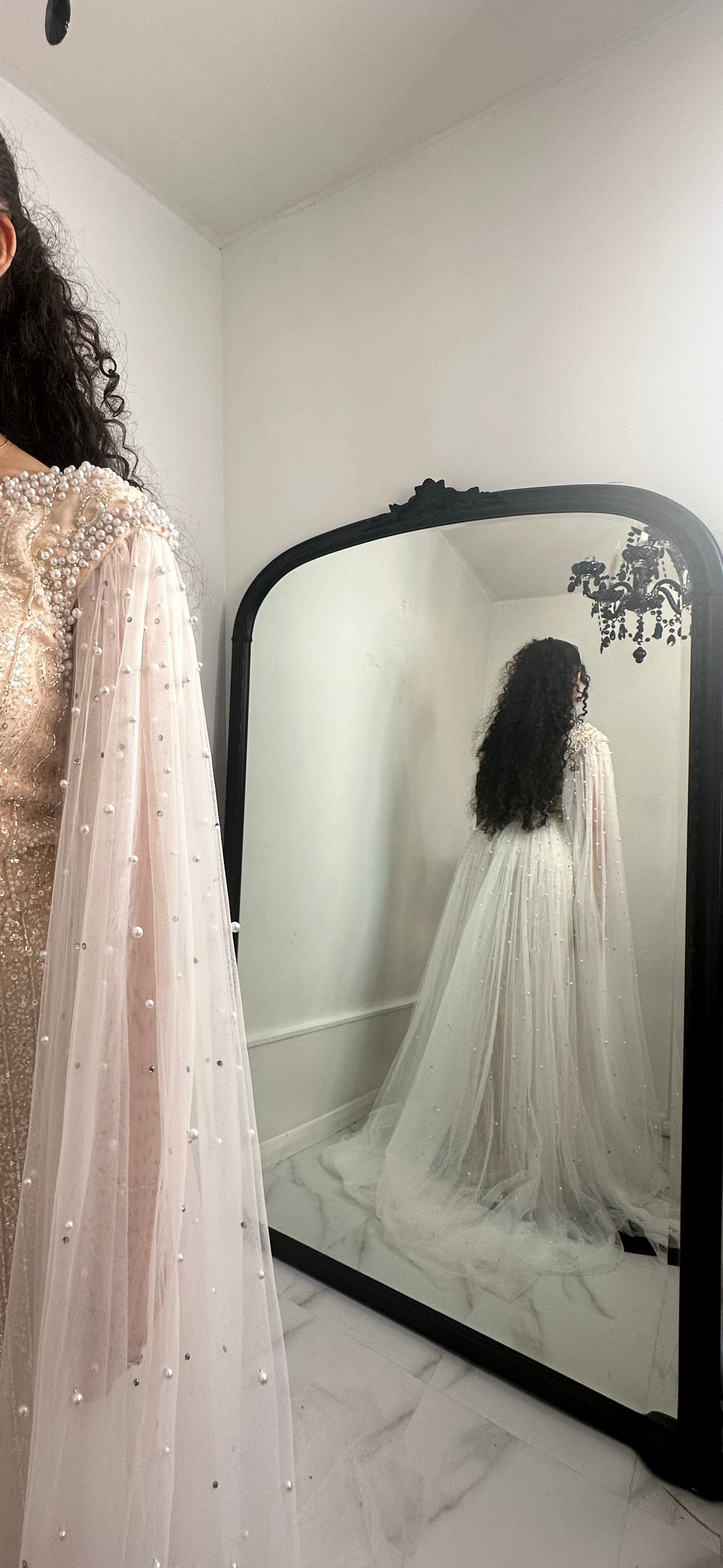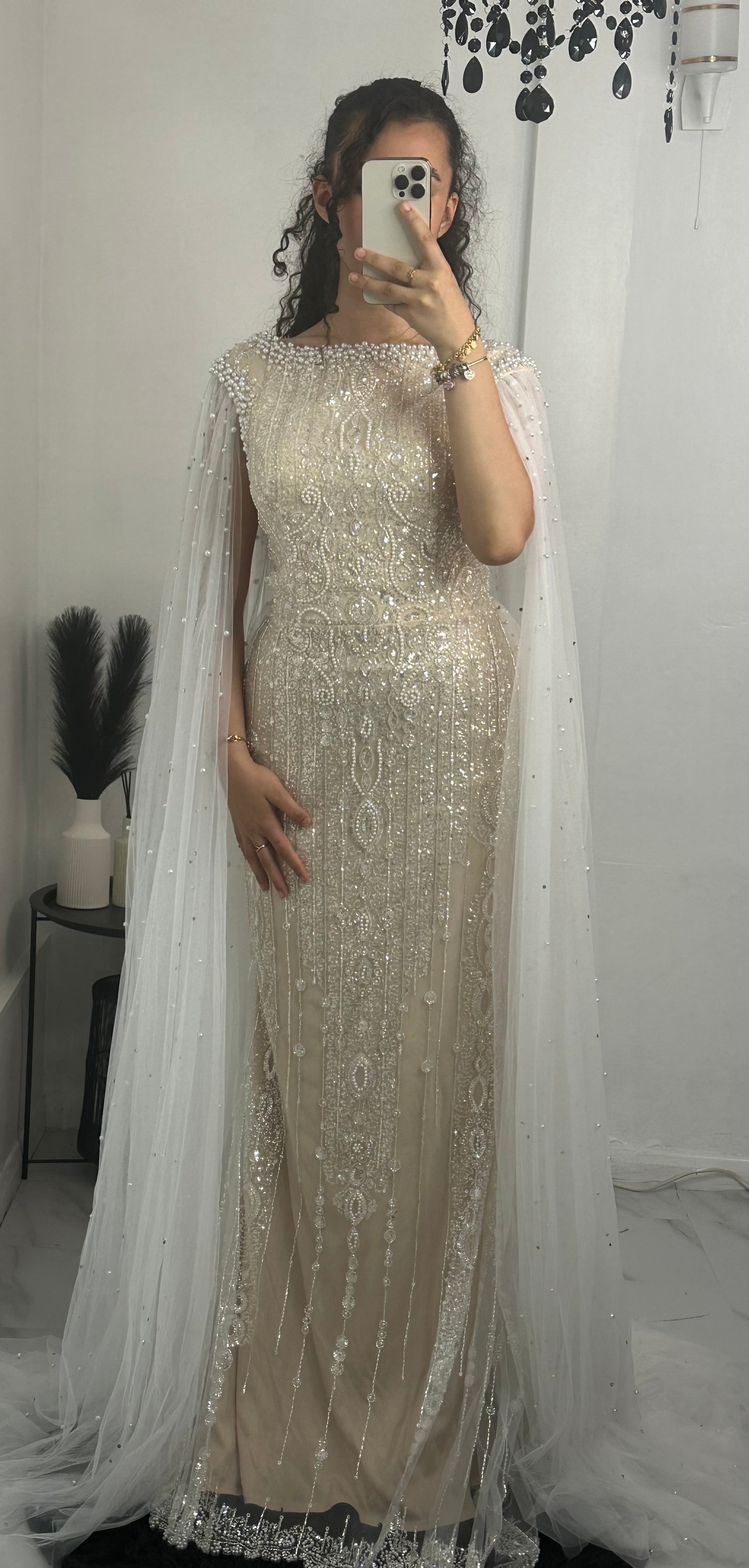 This Tulip Gown is the perfect choice for any occasion. With its mix of white and off-white embellishment, tulle caped sleeves, and tulle back skirt train, it is both elegant and versatile. From a bride's second dress to a gender reveal, this fully embellished maxi gown is sure to make a statement.